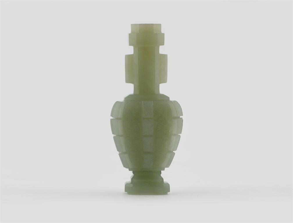 A Chinese pale celadon jade vase, of archaic bronze form, with a straight neck and flanges to the rectangular section body, crisply carved with debased taotie, 18th century, 8.1cm.