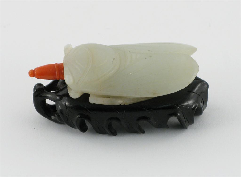 A Chinese pale celadon jade carving of a cicada, with a coral stopper, probably 19th century, together with a hard wood stand formed as a leaf with serrated edges, 6.4cm. (2)