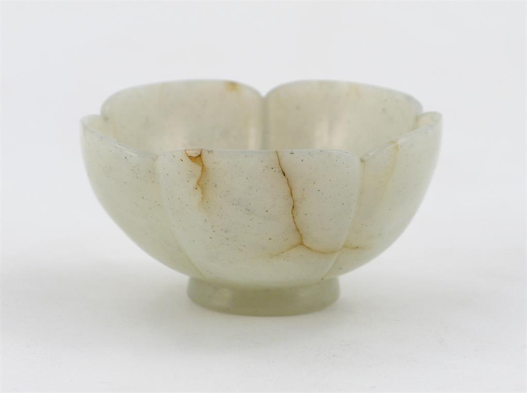 A small Chinese jade mallow-shaped bowl, the five petals rising from a short foot, probably early 19th century, 6.6cm. Provenance: Property of a Lady of title.