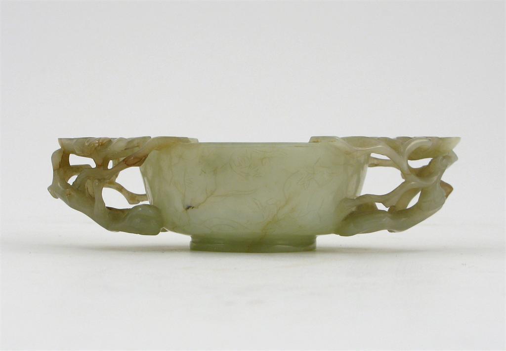 A Chinese celadon jade two handled cup, with a rounded bowl carved on one side in shallow relief with a single figure amidst bamboo and rockwork, the reverse with four lines of calligraphy and raised on a short straight footrim. The two handles pierced and worked in the form of gnarled prunus branches, each with a single blossom, Ming dynasty, 16th/17th century, 14cm.