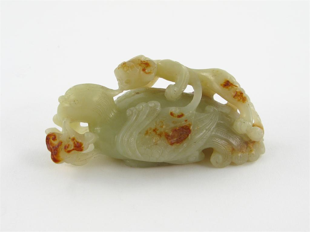 A Chinese yellow jade carving of a phoenix, with a ruyi fungus in its beak, a bifid dragon clambering upon its back, the stone with flecks of brown skin, 19th/20th century, 8cm.