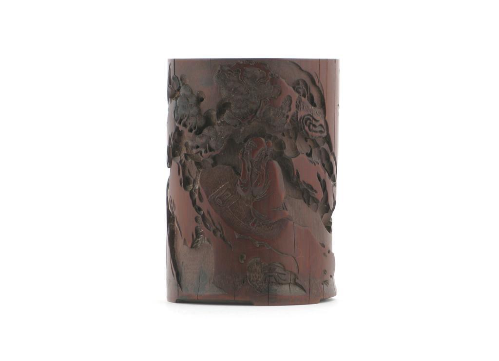A Chinese bamboo cylindrical brush pot, deeply carved with two figures amidst rockwork and kneeling beneath a pine tree, probably 19th century, some splits, 13.1cm.