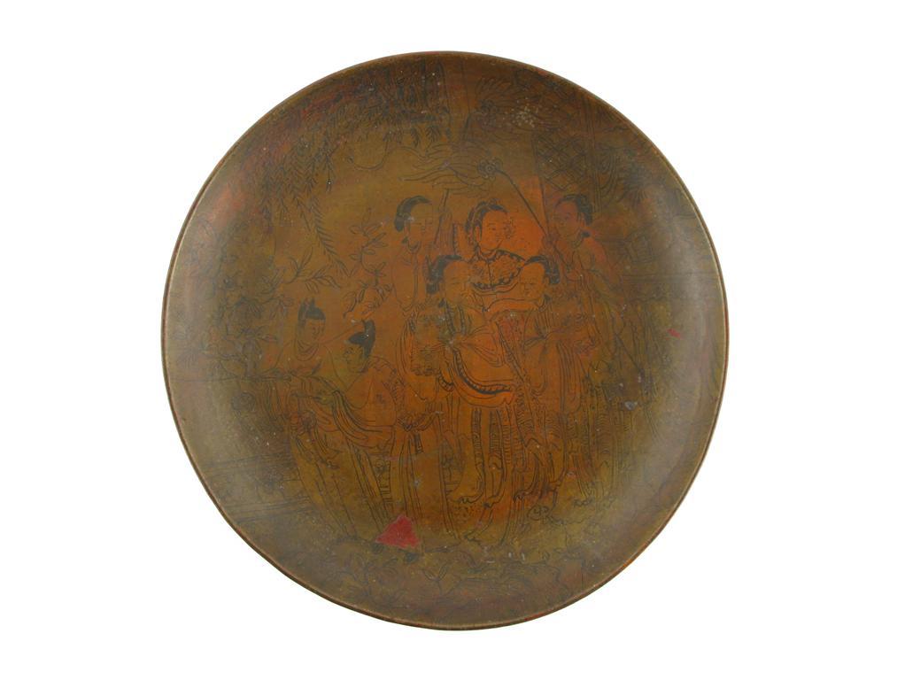 A Chinese lacquered shallow dish, finely painted with seven maidens on a terrace beneath leafy trees, finely drawn in black on a green-brown ground, 1st half 19th century, minor damage, 21.7cm.