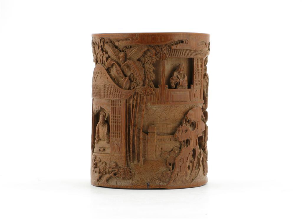 A Chinese bamboo cylindrical brush pot, carved with two figures beneath a pine tree and further figures at windows, amidst rocks, bamboo and a maple tree, the reverse with a three character inscription, 16cm.