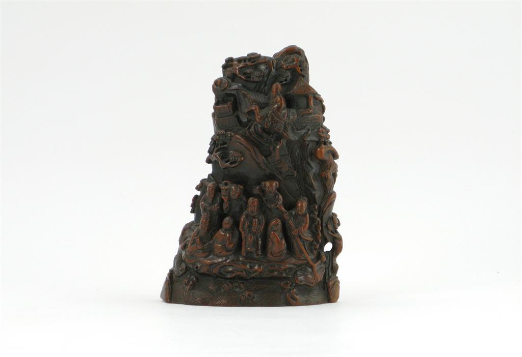 A Chinese carved hardwood model of a mountain, one side with immortals amidst pagodas and pine trees, the reverse with a waterfall and trees, 19th century, 18.5cm.