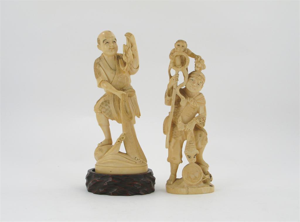 Two Japanese ivory figures, one a fisherman holding a crab, the other with a monkey on his shoulder, Meiji 1868-1912, 19.5cm max. One with a wood stand. (3)