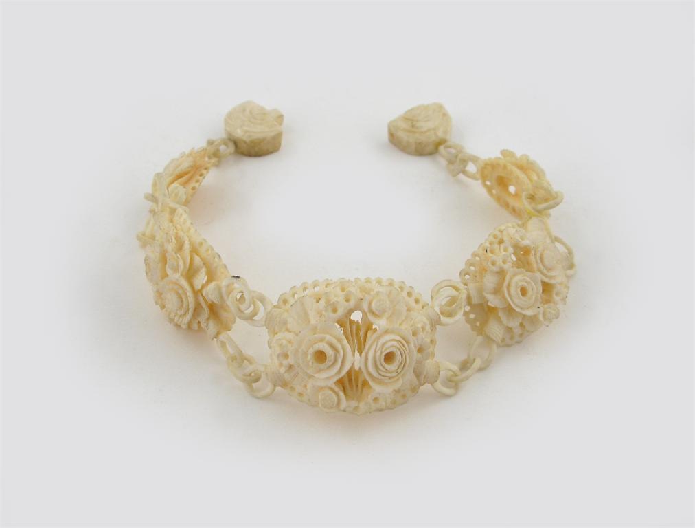 A Chinese ivory carved bracelet, formed as floral plaques linked by chains, c.1900, minor damages, 21cm. In a fitted box. (3)