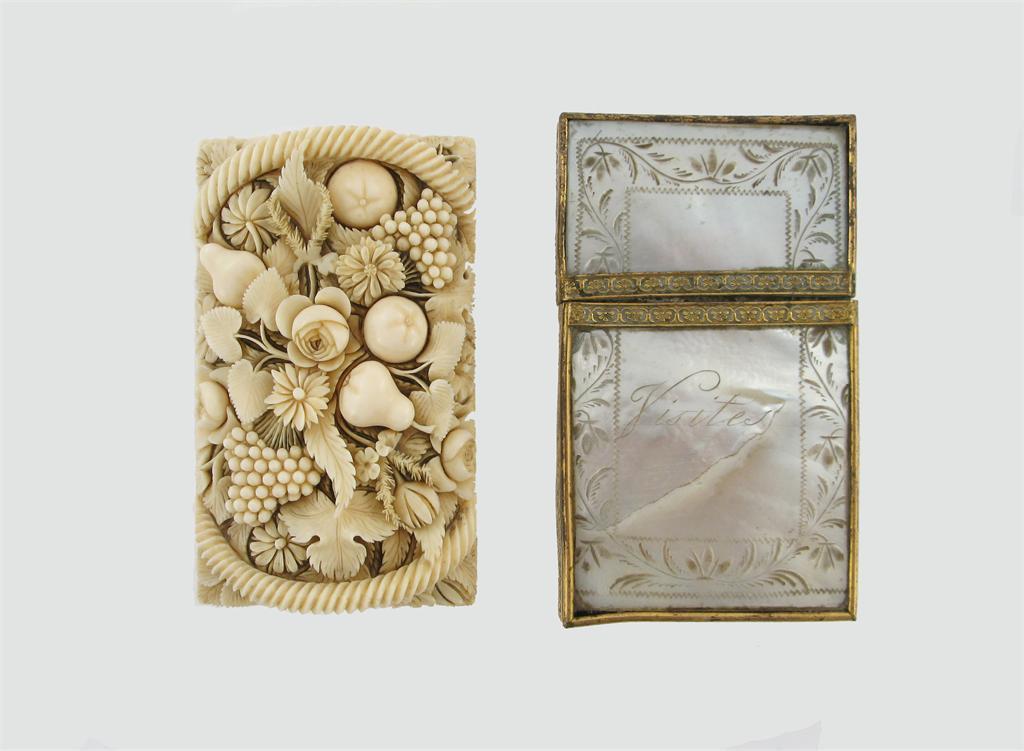 A mother of pearl and gilt metal card case, inscribed 'Visites' and a rectangular box and cover elaborately carved as a basket of fruit and flowers, both 19th century, minor damages, 9.5cm. (4)