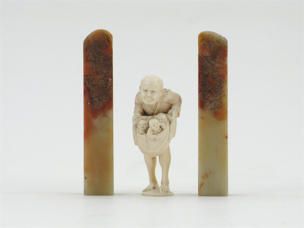 A Japanese ivory okimono netsuke, of an old man bent over, carrying three small boys in a sack together with two uncut soapstone seals carved with families of chickens, 10cm. (3)