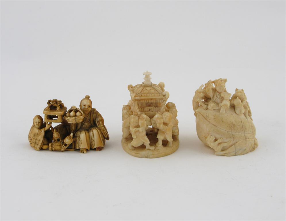 Three small Japanese ivory carvings, depicting figures in various pursuits, two with signatures, 19th century, damages and repairs, 5.5cm max. (3)