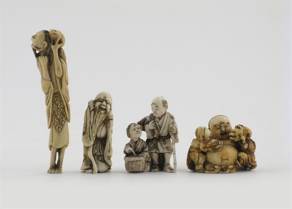 Four small Japanese ivory carvings, depicting various figures, two with inscriptions, 19th century, 8.5cm. (4)