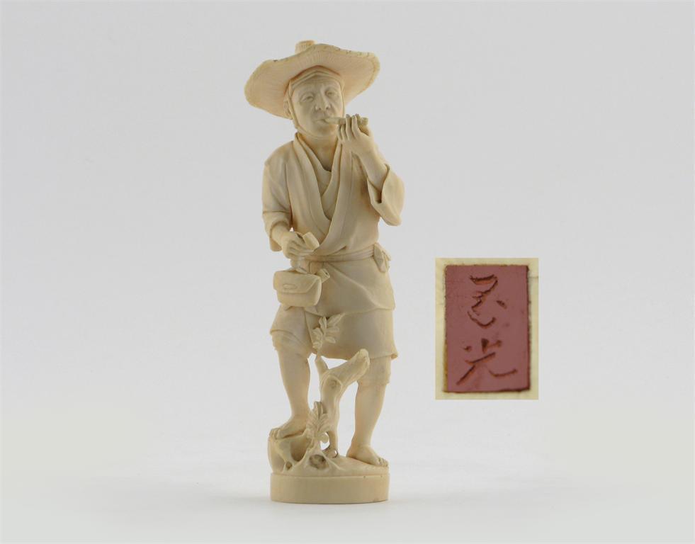 A Japanese ivory carving of a man, standing and smoking a pipe, wearing a wide brimmed hat, Meiji 1868-1912, the base inset with a red lacquer plaque with a two character mark, 17cm.