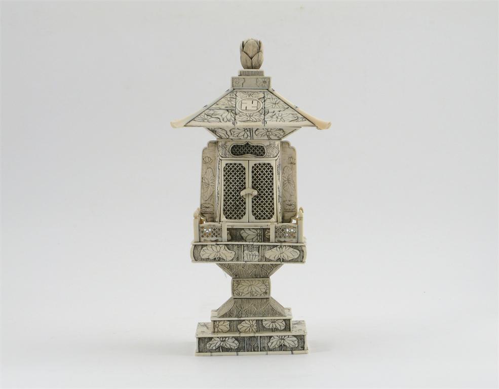 A Japanese ivory zushi shrine, formed as a pagoda with a pair of lattice work doors enclosing an altar and a small figure of Buddha, 19th / early 20th century, 30cm.