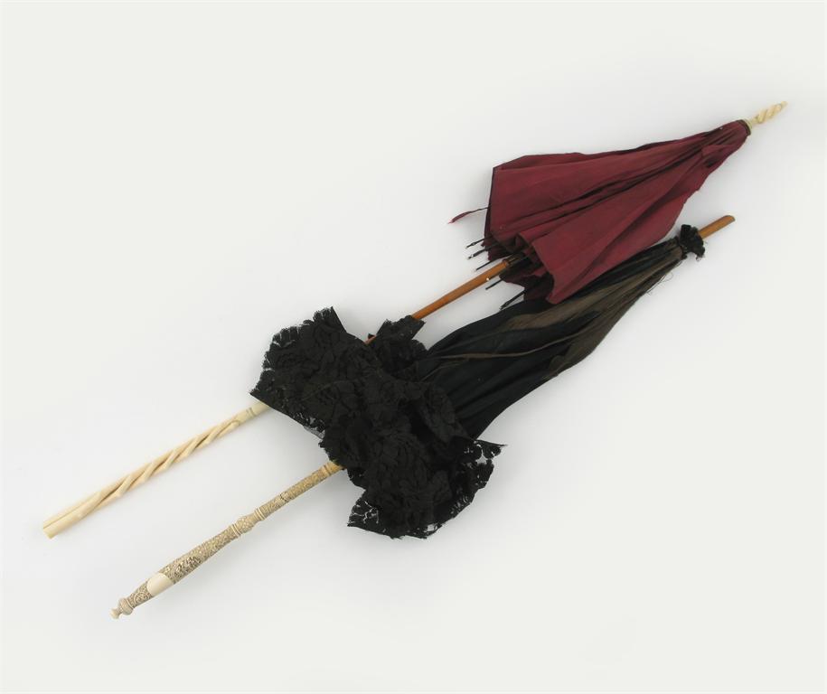 Two parasols, one with an elaborate ivory handle carved as three spiralling stems, the other handle carved Canton ivory, both c.1900, the fabric panels extensively distressed, 90cm max. (2)