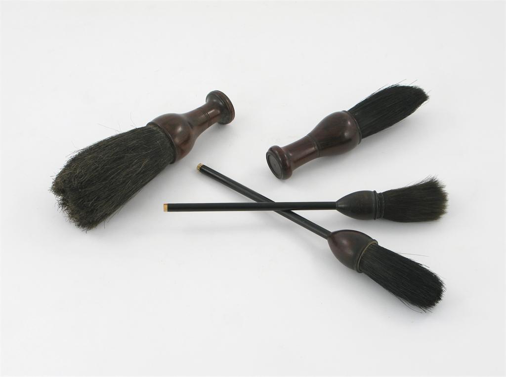 Four Chinese hardwood brushes, two with long cylindrical handles tipped in bone or ivory, the others with turned handles, 30cm max. (4)
