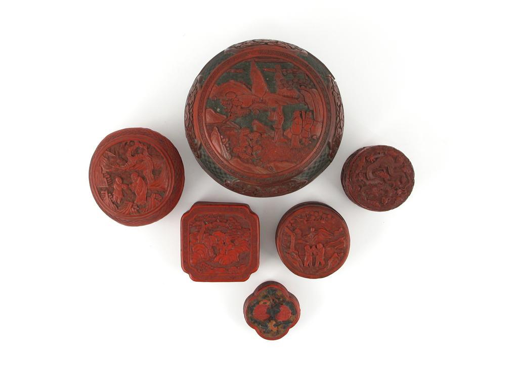 Six Chinese cinnabar lacquer boxes and covers, four carved with figures in rocky landscapes, one with fruit and flowers and one with carved with scaly dragons amidst cloud scrolls, 19th century, all with damages, 20cm max. (12)