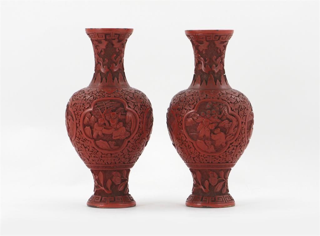 A pair of Chinese red cinnabar lacquer vases, each decorated with four quatrefoil panels of figures on a ground of flowers and foliage, 19th century, restoration to the rims, 25.4cm. (2)