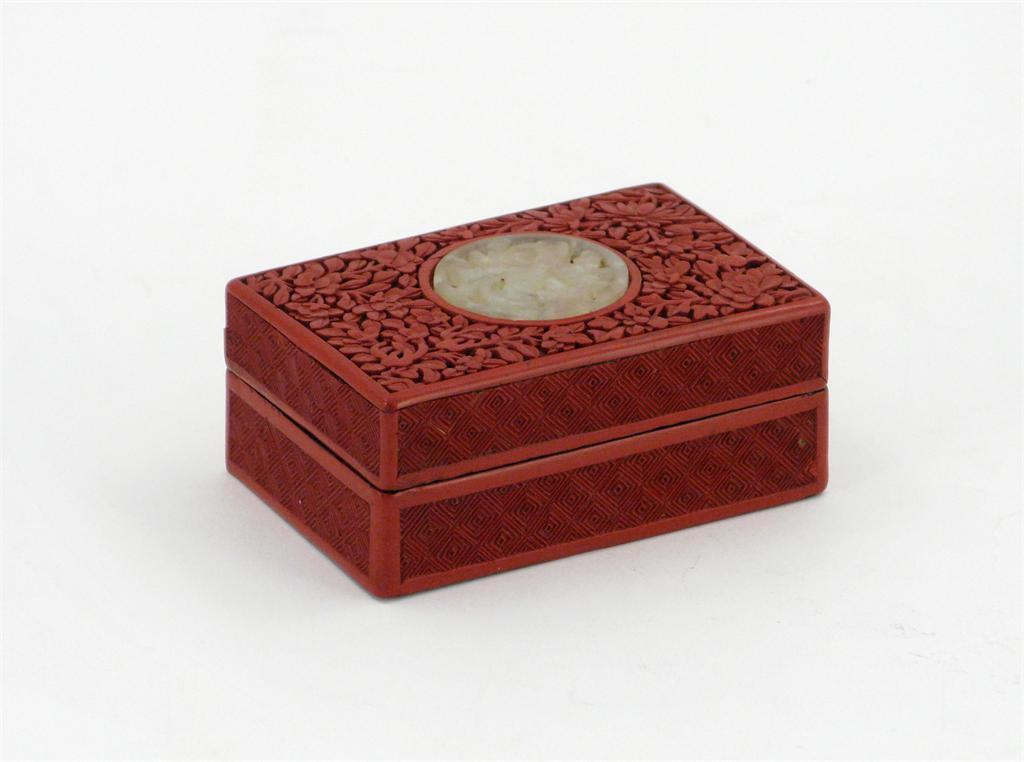 A Chinese red cinnabar lacquer rectangular box, the cover inset with a bowenite roundel and decorated with flowers and foliage, 19th/20th century, 10cm. (2)