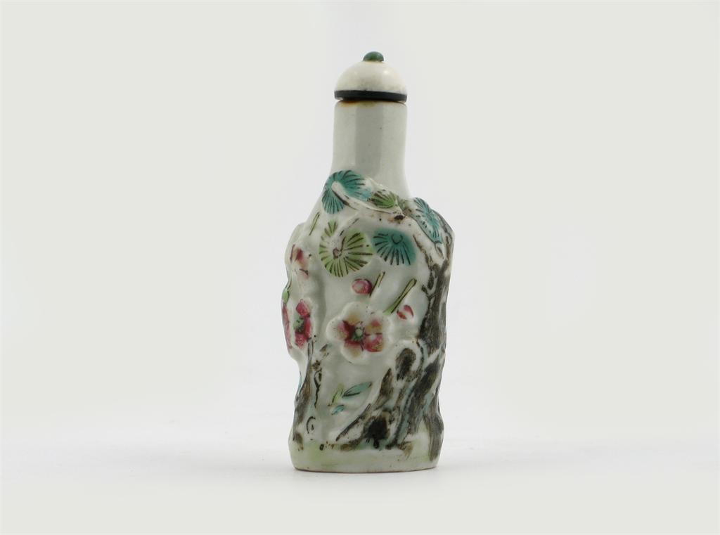 A Chinese porcelain scent bottle, modelled with prunus and pine tree encircling a bamboo trunk, painted in famille rose enamels, 18th century, 8cm.
