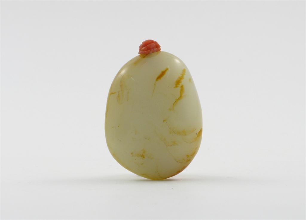 A Chinese snuff bottle, formed from a jade pebble, the stone with traces of brown skin, probably 19th century, 6.5cm.