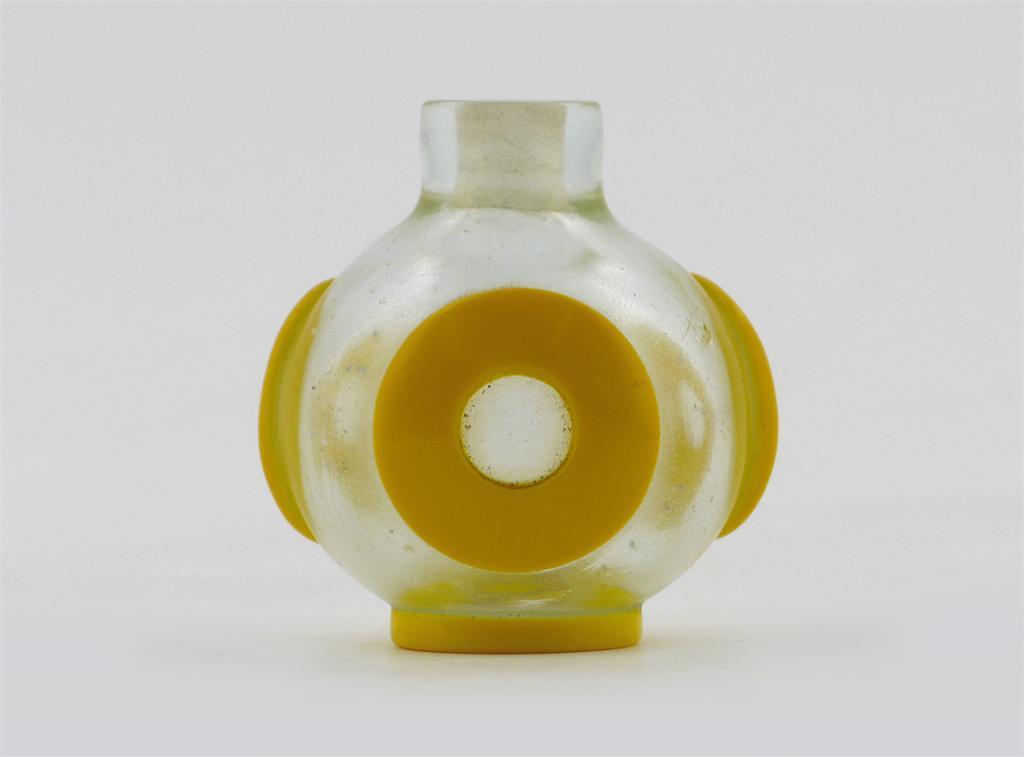 A Chinese Beijing glass spherical snuff bottle, decorated with overlaid yellow rings, 19th/20th century, 5cm.