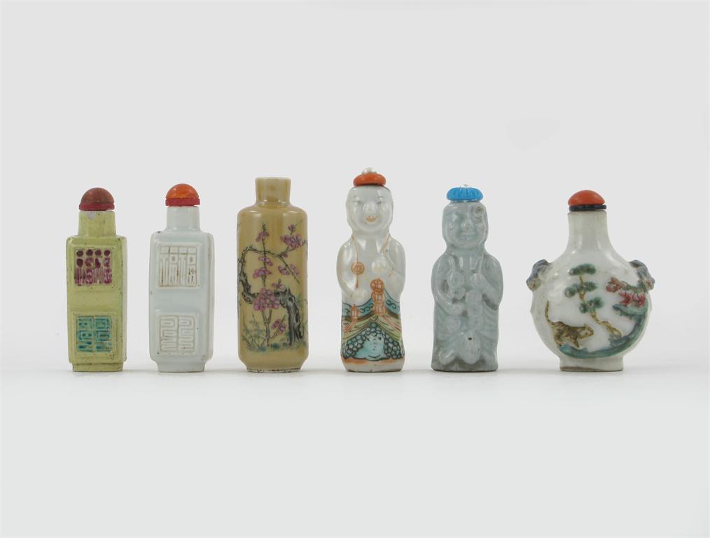 Six various Chinese porcelain snuff bottles, two depicting figures, one moulded with animals in a landscape, and two rectangular, 19th/20th century, 7.5cm max. (6)