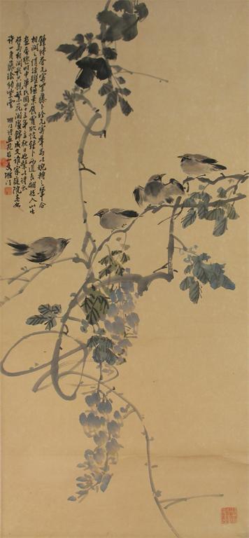 A Chinese scroll painting, of finches on a leafy branch and with five columns of calligraphy and four red seals, creased and stained, 91cm.