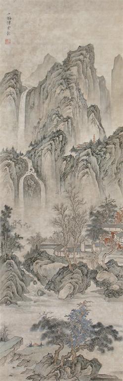 A Chinese scroll painting of a mountainous landscape, with waterfalls, small buildings and trees growing from rocky outcrops, five character inscription and a red seal mark, 127cm x 41cm.