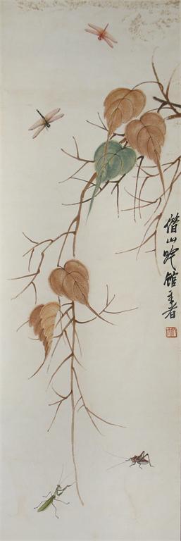 A Chinese scroll painting, depicting dragonflies, two crickets and a praying mantis, some staining, 121cm x 41cm.