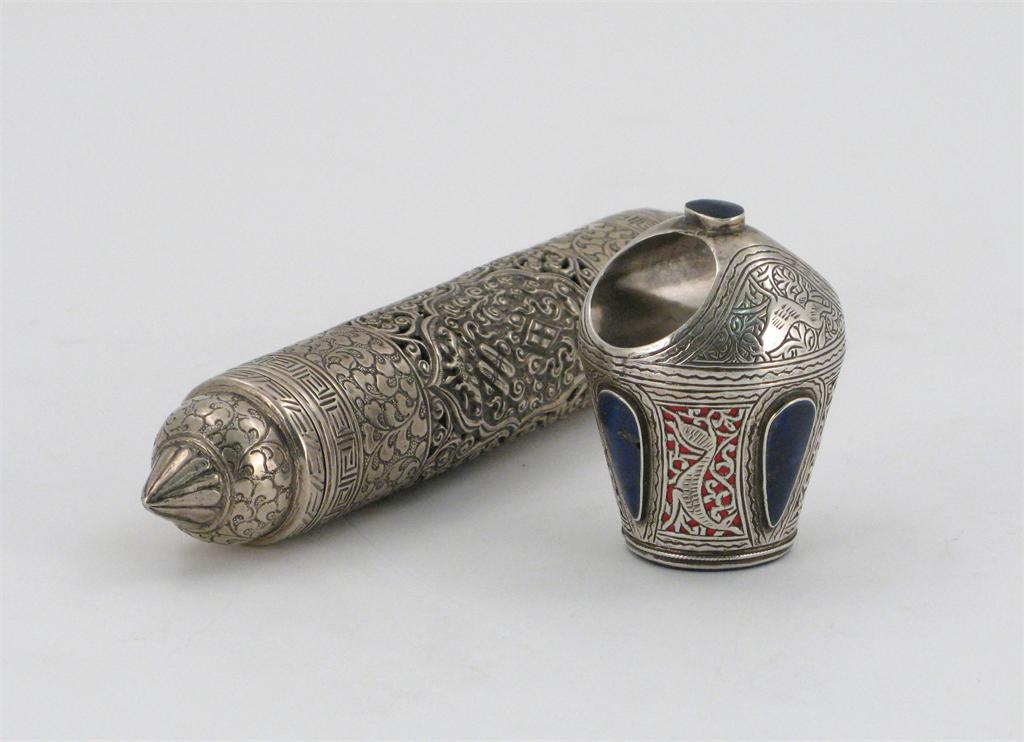 A silver coloured metal scroll case, probably Indian, decorated with a repoussé panel on a reticulated ground, together with a lapis seal, depicting a sinuous deer with a silver coloured metal and lapis mount, 19th/20th century. 20.5cm max. (3)