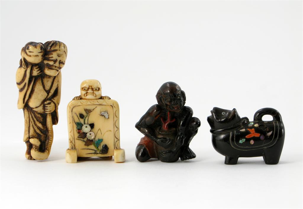 Four Japanese okimono netsukes, one a bone figure with a toad on his shoulder, another peering over a screen, one of a crouching figure, and another of a curious dog-like animal, most 19th century, 6cm max. (4)