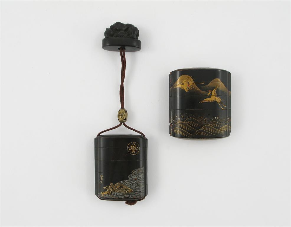 Two Japanese black and gold lacquer inro