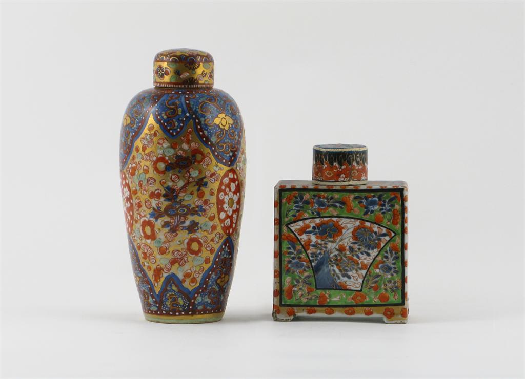A Chinese ovoid vase and cover, and a tea canister and cover, both later enamelled with flowers and foliage, 18th century and later, both with damages, 23cm max. (4)