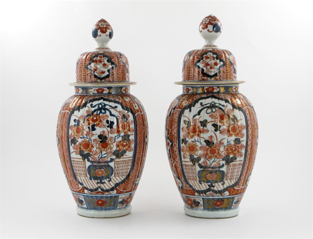 A pair of Japanese Imari fluted ovoid vases and covers, painted with panels of flowers, 19th century, 46cm. (4)