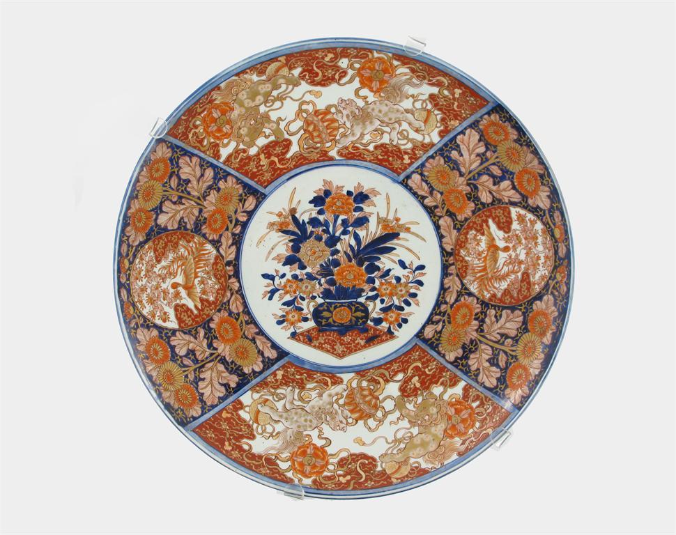 A massive Japanese Imari dish, painted with panels of lion dogs and phoenix around a central floral medallion, 19th century, 61.5cm.