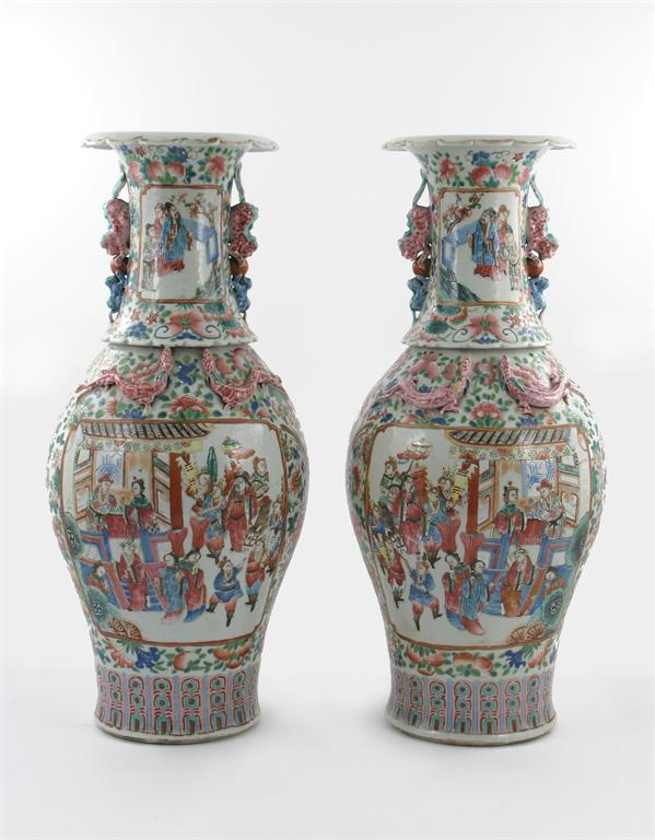 A large pair of Chinese Canton famille rose vases, painted with panels of figures on a ground of fruit, flowers and birds, 19th century, some good restoration, 63cm. (2)