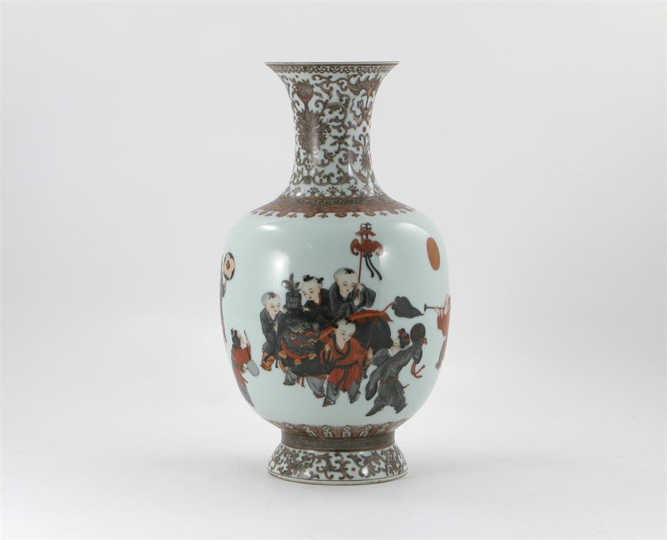 A Chinese 'boys' vase, painted in iron red, black and brown, with small boys at play and with calligraphy to the reverse, the base with a four character Qianlong mark but 20th century, 37.5cm.