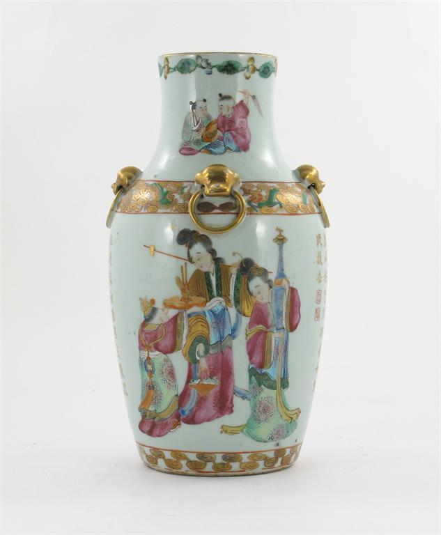 A Chinese famille rose vase, each side painted with figures divided by gilt calligraphy, 19th century, a little wear to the gilding, 35.5cm.