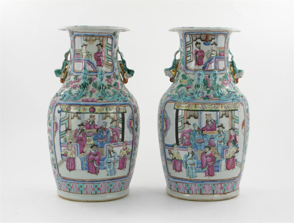 A pair of Chinese Canton famille rose vases, painted with panels of figures, 19th century, each with a little restoration, 35.5cm. (2)