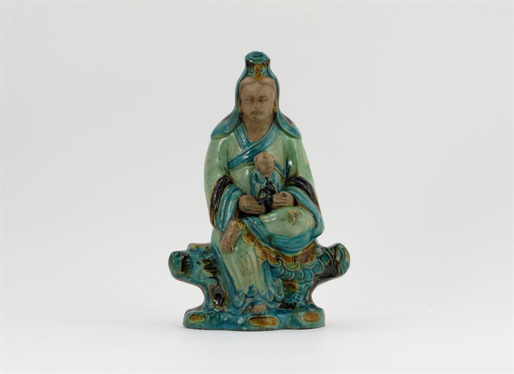 A Chinese tilework pottery figure of Guanyin, sitting with a small boy held in her lap, and decorated with green, turquoise and brown glaze, Ming dynasty, c.16th century, 28.5cm.