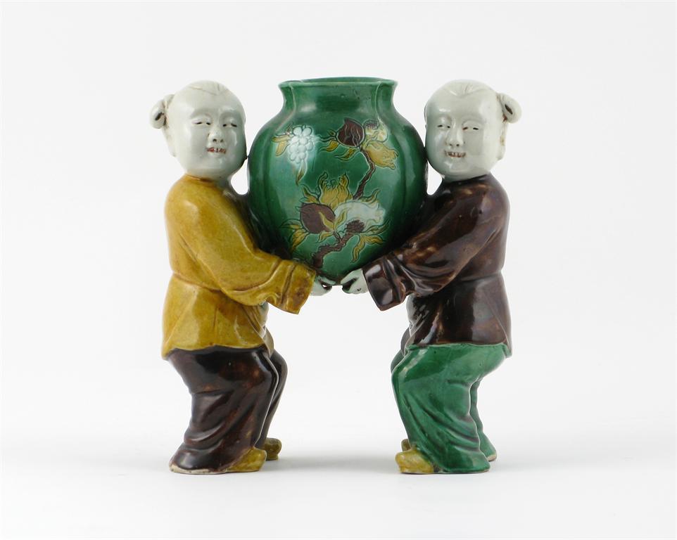 A Chinese model of two boys, holding a large green vase decorated with an incised fruiting branch, glazed in yellow, brown and green, 19th century, 19cm.