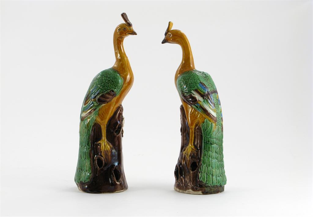 A pair of Chinese polychrome models of peacocks