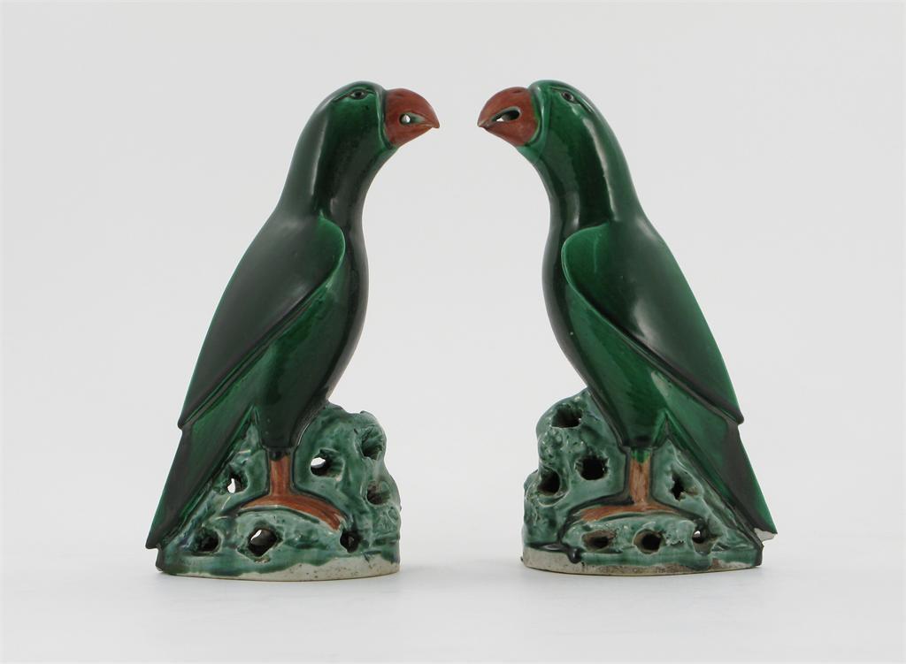 A pair of Chinese green glazed models of parrots, standing on rocks, 19th century, each with a small chip, 21cm. (2) Provenance: From the estate of Niel Rimington (1928-2009) of Fonthill Old Abbey, Wiltshire.