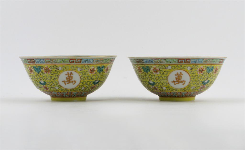 A pair of Chinese yellow ground medallion bowls, each painted with four roundels containing gilt characters on wide floral and leaf scroll bands, each with a six character Guangxu mark and probably of the period, 12.7cm. (2)