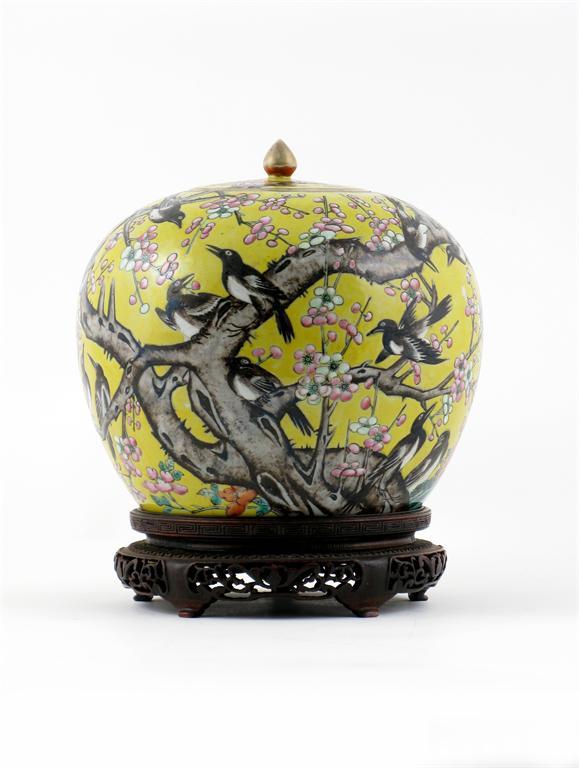 A Chinese yellow ground ovoid vase and cover, painted with magpies amidst a flowering prunus tree, 19th / early 20th century, together with a carved wood stand, 21cm. (3)
