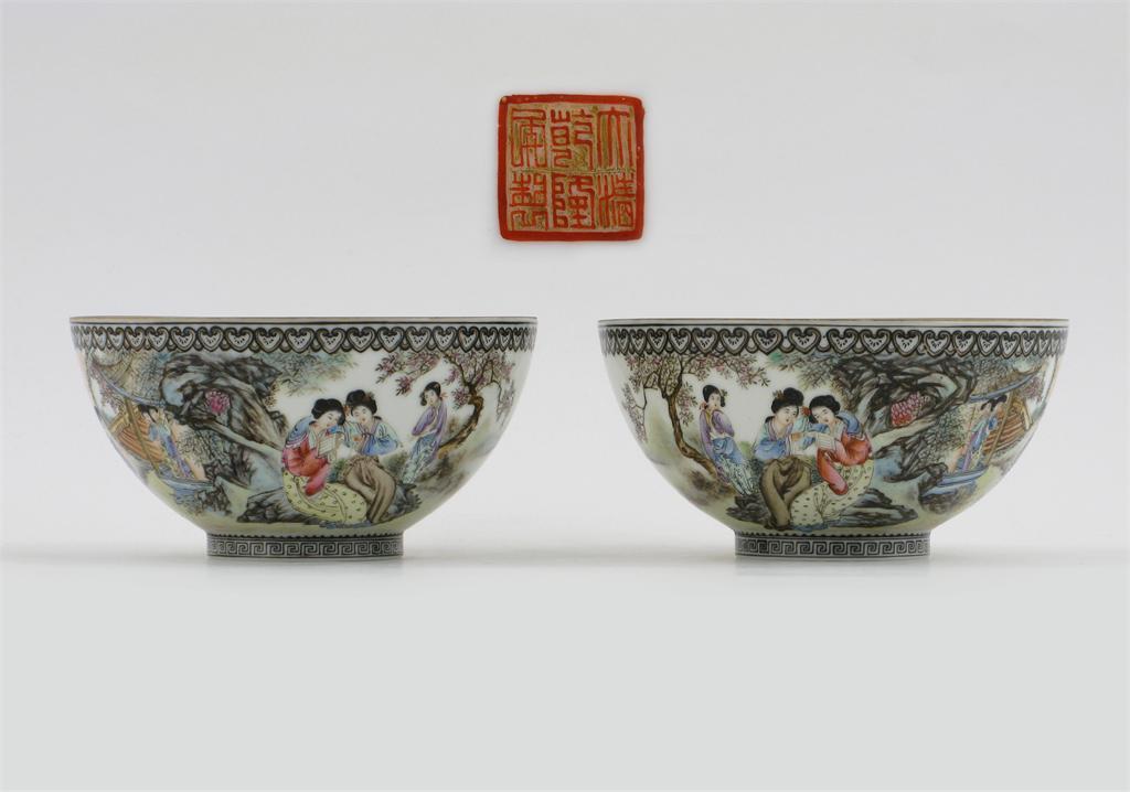 A pair of Chinese eggshell porcelain bowls, each painted with young ladies in gardens and with calligraphy to the reverse, each with a six character Qianlong seal mark but 20th century, 12.8cm. (2)
