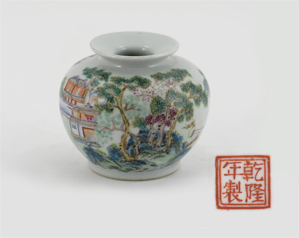 A small Chinese famille rose vase, painted with figures and pagodas in a watery landscape the base with a four character Qianlong mark but 20th century, 8.5cm dia.