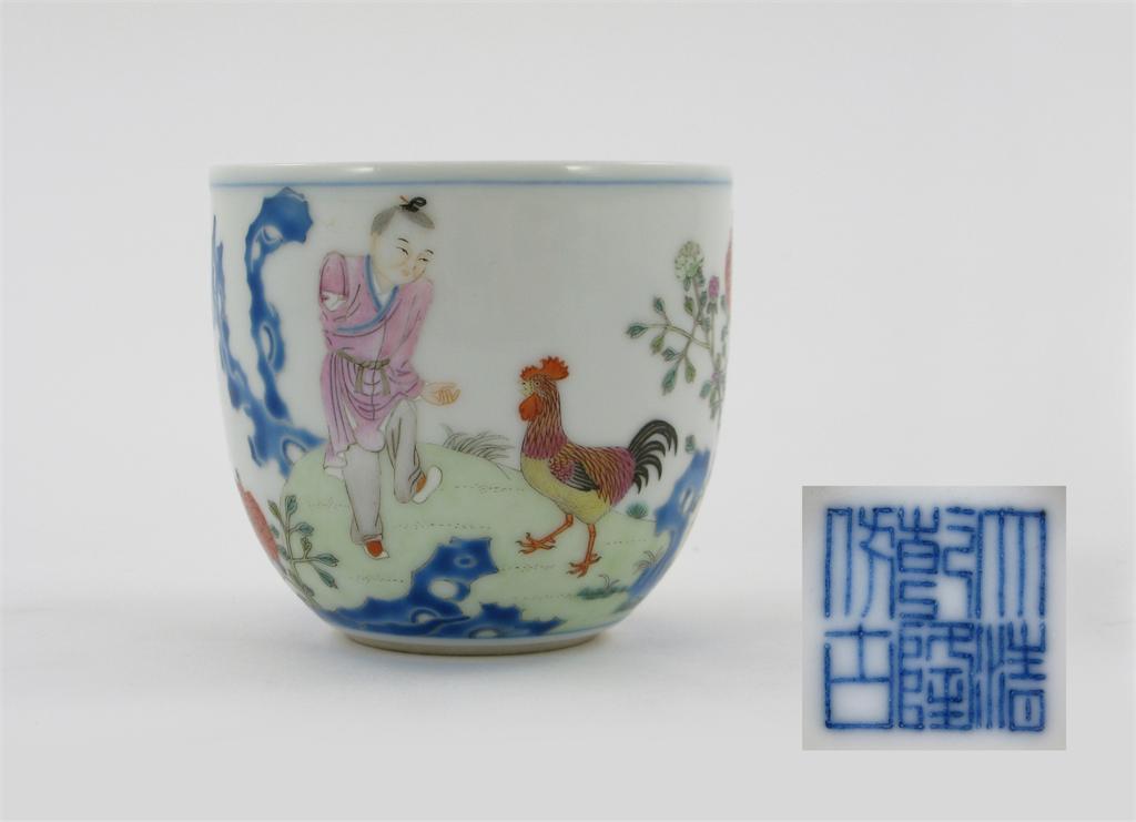 A Chinese famille rose U-shaped cup, painted with a boy in a garden with a large chicken between blue rock work and flowers, the reverse with seventeen rows of calligraphy, the base with a six character Qianlong mark, but later, 8.1cm wide.