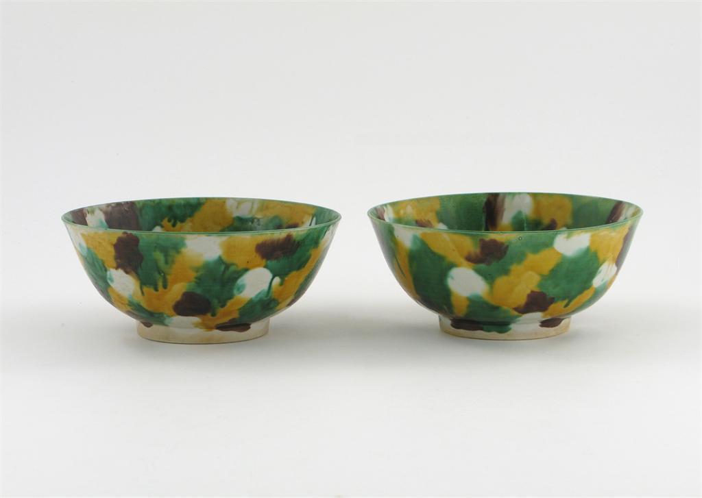 A pair of Chinese brinjal bowls, decorated inside and to the exteriors in green, yellow and aubergine, Kangxi 1662-1722, glaze wear and rim damage, 18cm. (2)