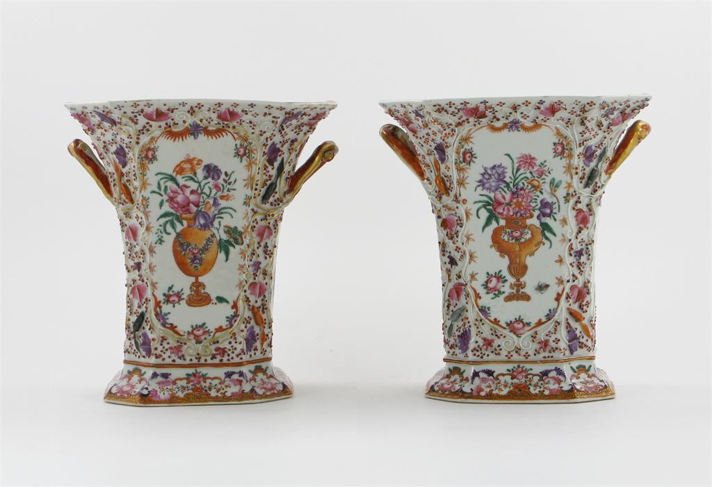 A pair of Chinese famille rose square-section flared vases, painted with panels of vases and flowers on a ground moulded and applied in relief with squirrels and vines, late 18th century, a little good restoration, 23.5cm. (2)